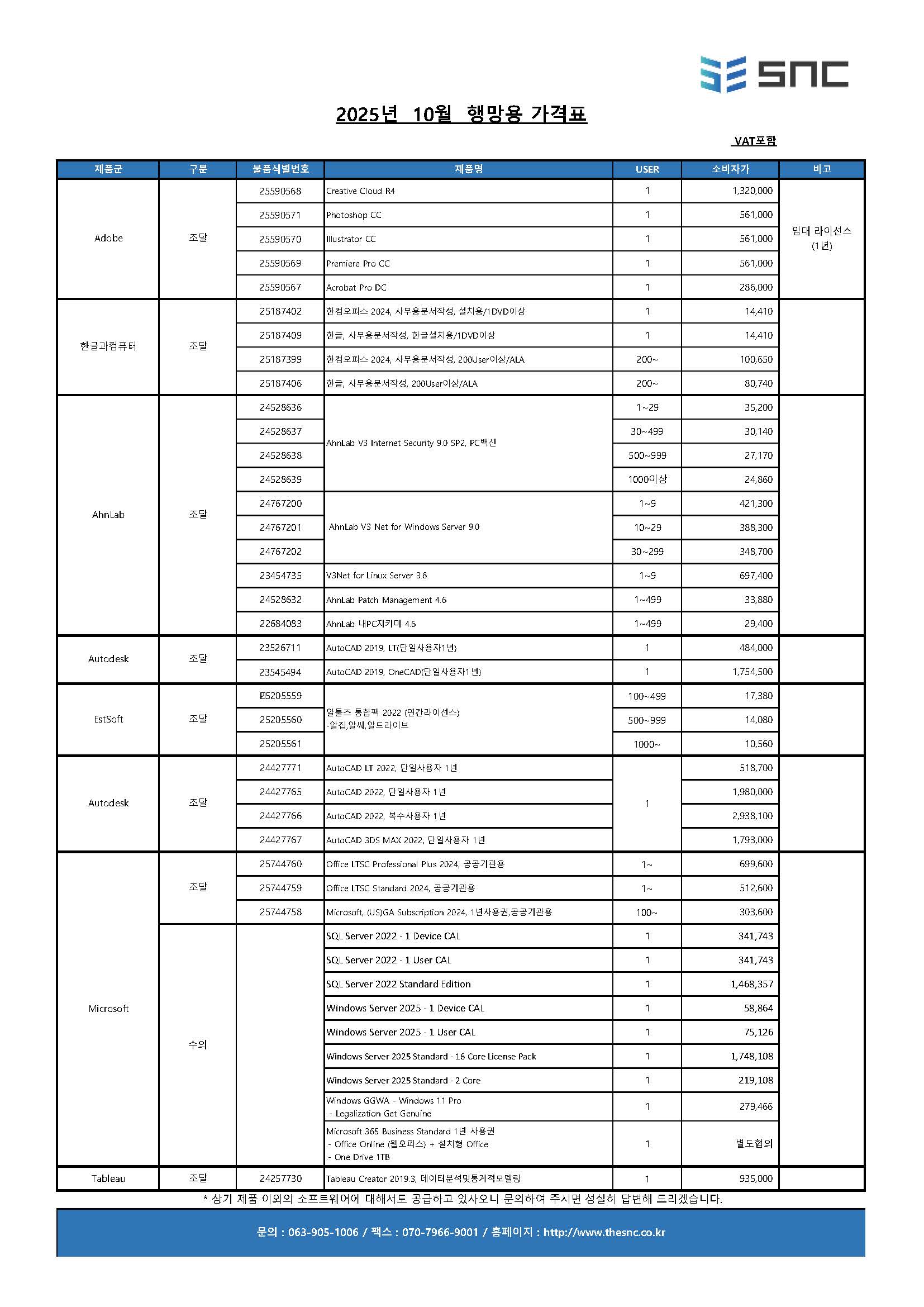2025년 10월 공공기관용 소프트웨어 가격표를 첨부 드리오니, 많은 관심 부탁드립니다.